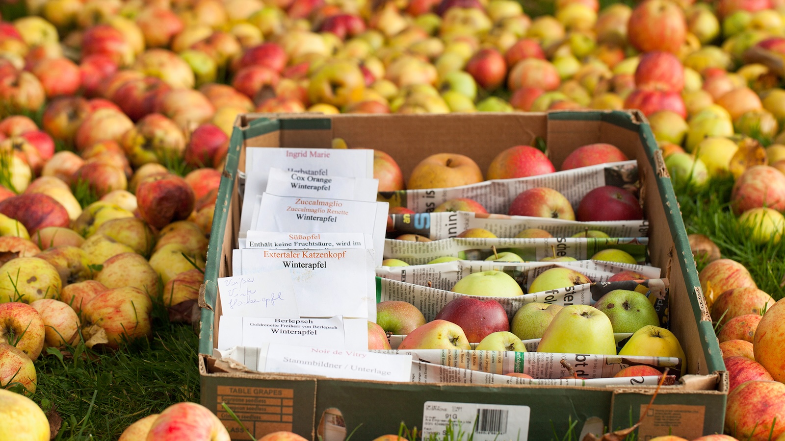 An diesem Wochenende führt Jan Bade die knapp 25 Kursteilnehmer in die Welt der Pomologie ein. Pomologie ist die Lehre der Arten und Sorten von Obst. Eine mitunter lohnende, leckere, aber auch sehr spezielle Wissenschaft, bei der es darum geht, die Grundlagen zur Bestimmung und die gängigsten regionalen Apfel-Sorten kennenzulernen.