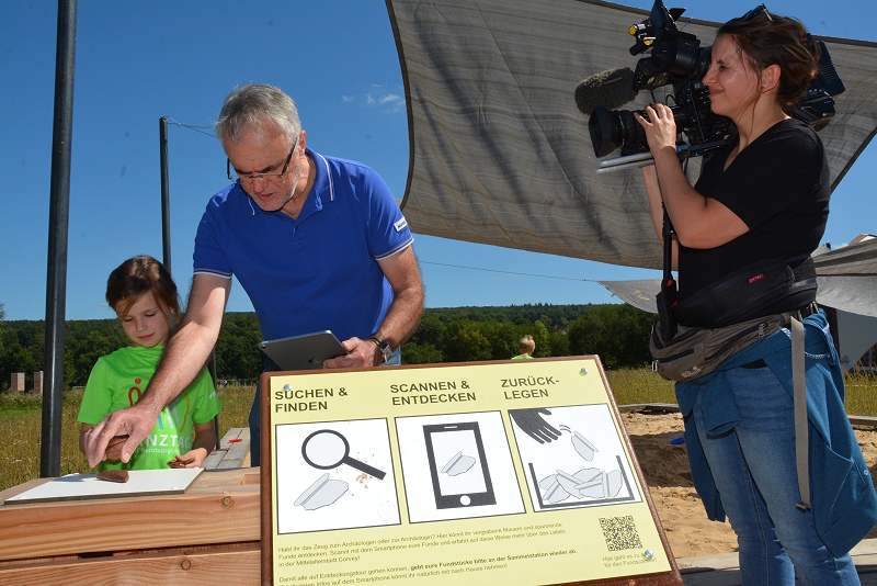 Ab sofort sind im Sand wahre Schätze verborgen – jedenfalls historisch gesehen. Dabei handelt es sich um unterschiedliche kleine Fragmente, die man erst einmal im Sand aufspüren muss, mit Schippe und Sieb. Danach kann man mit Hilfe einer App bestimmen, was es mal gewesen ist. LGS-Archäologe Ralf Mahytka macht es den Kindern vor, wie man dabei vorgeht. Ist ein Teil von den Kindern gefunden worden, so können sie die Fragmente scannen und in einem virtuellen Sammelalbum mehr über ihre Funde erfahren. Wo im Mittelalter noch die Stadt Corvey stand, die 1265 bei Nacht und Nebel zerstört wurde, ist es seit Eröffnung der Landesgartenschau erstmals möglich, in die Mittelalterstadt wortwörtlich einzutauchen. Mittels Augmented Reality und der App „LGS Höxter“ bauen sich die Marktkirche, der historische Hellweg oder das Haus des Chirurgen auf dem Bildschirm vor einem auf - sogar hineinzugehen und sich umzuschauen ist möglich.